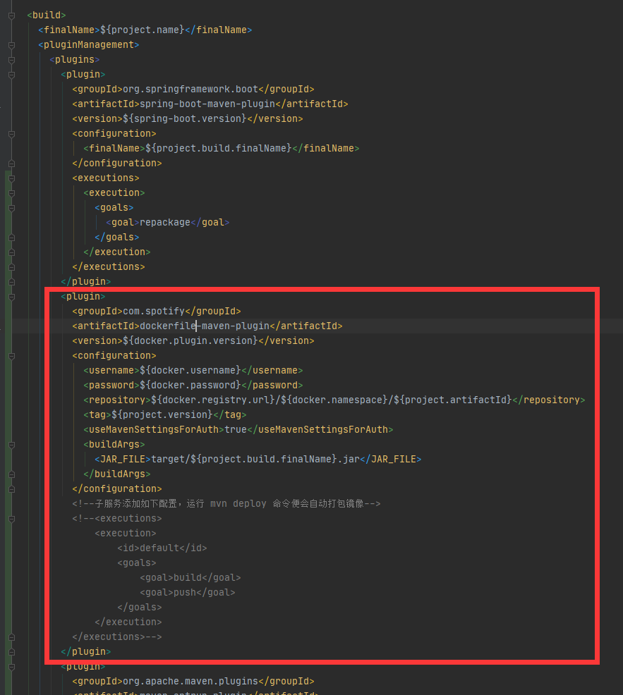 <!--子服务添加如下配置,运行 mvn deploy 命令便会自动打包镜像-->