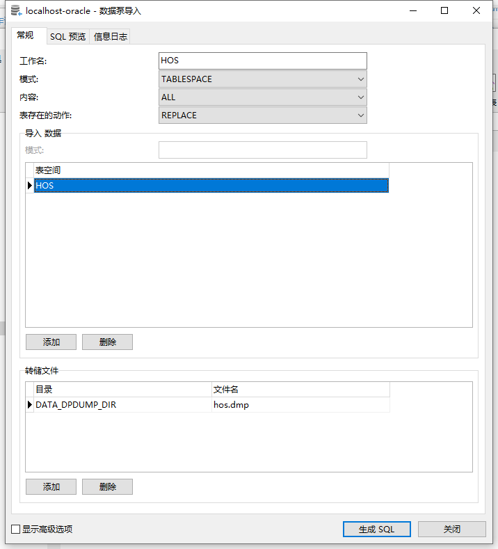 DECLARE h1 NUMBER; BEGIN h1 := DBMS_DATAPUMP.OPEN('IMPORT', 'TABLESPACE', NULL, 'HOS'); DBMS_DATAPUMP.ADD_FILE(h1, 'hos.dmp', 'DATA_DPDUMP_DIR', NULL, DBMS_DATAPUMP.KU$_FILE_TYPE_DUMP_FILE); DBMS_DATAPUMP.METADATA_FILTER(h1, 'TABLESPACE_EXPR', 'IN (''HOS'')', NULL); DBMS_DATAPUMP.SET_PARAMETER(h1, 'TABLE_EXISTS_ACTION', 'REPLACE'); DBMS_DATAPUMP.START_JOB(h1, 0, 0, 1, NULL); DBMS_DATAPUMP.DETACH(h1); END;