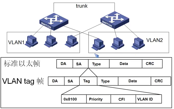 - VLAN ID:12个二进制位进行标识,212-2个VLAN,可分配1-4094个VLAN。其中4096、4095保留。